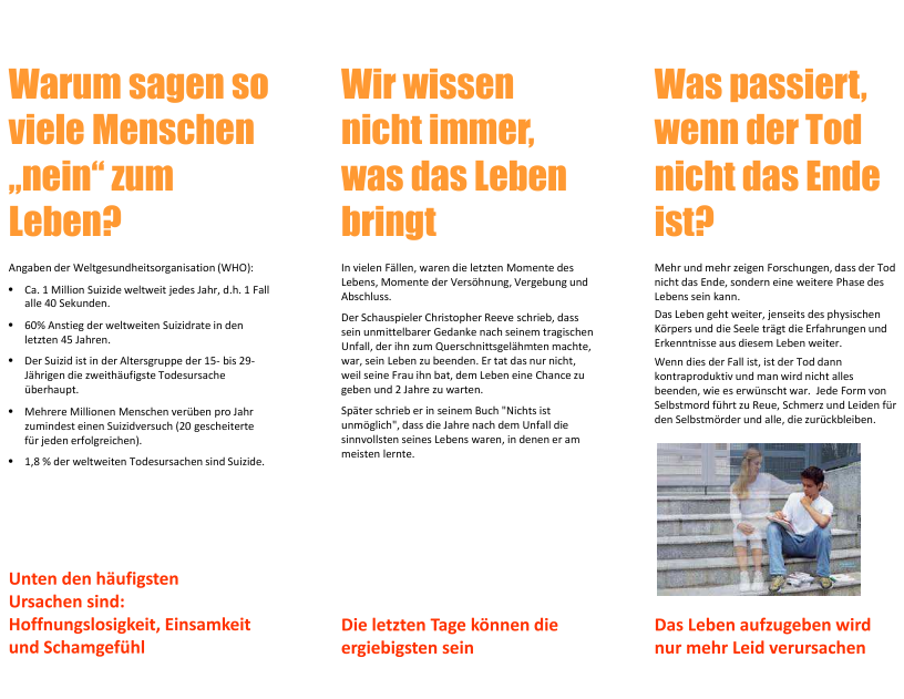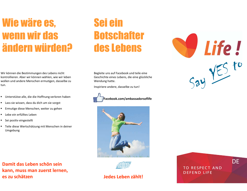 Selbstmord ist ein Problem der öffentlichen Gesundheit, das Menschen jeden Alters, jeder Nationalität, jedes Geschlechts und jeder sozialen Schicht auf der ganzen Welt betrifft. Es ist eine traurige Realität, mit der viele Menschen konfrontiert sind. Die Kampagne „Sag JA zum Leben“ möchte Ressourcen bereitstellen, um den Gefährdeten zu helfen, und uns alle daran erinnern, dass Prävention möglich ist.